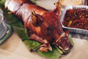 レチョンは、豚を丸ごと炭火で回転させながらじっくり焼き上げる料理で、皮は薄く均一にパリッと仕上がります。